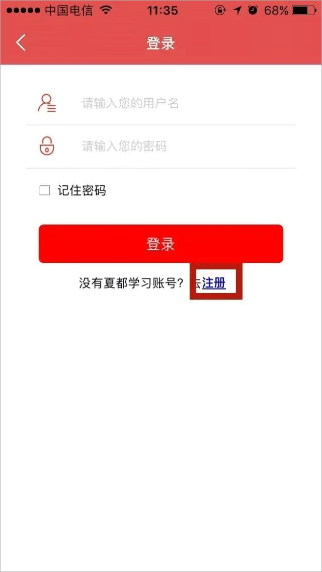 1、下载安装好后,打开进入登陆注册页面,点击“注册”蓝色字体