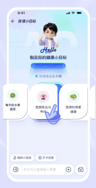 支持用户根据自身需求制定运动、饮食、睡眠等多类型的健康打卡计划,并进行定时提醒,帮助用户养成规律健康的生活方式。