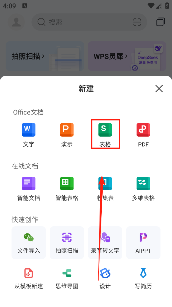 2、可以新建文字、演示、表格等多种文档,点击“表格”