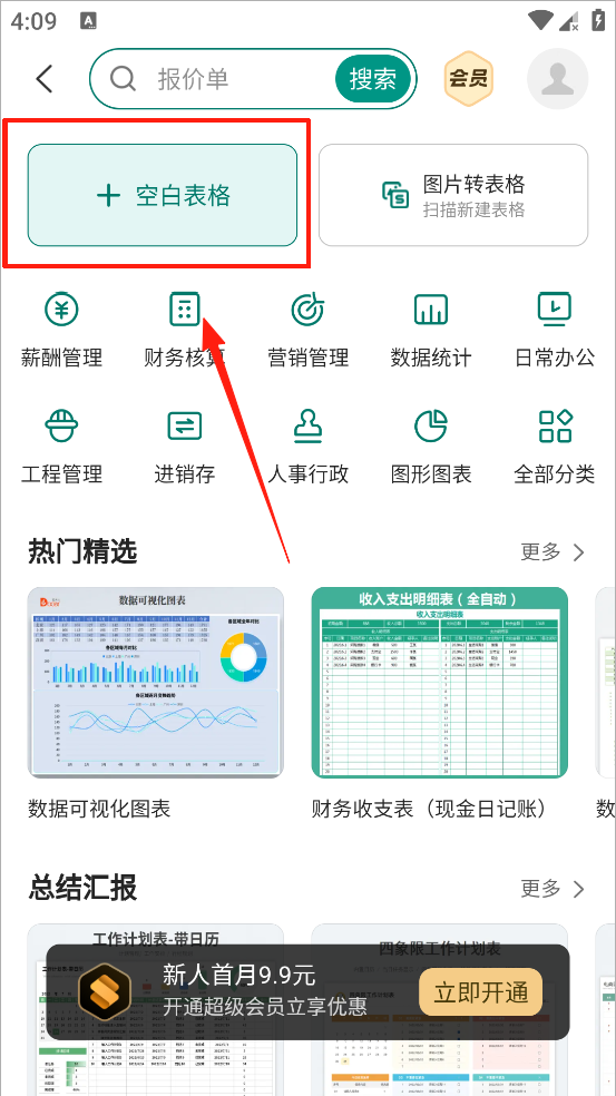 3、新建的时候,app内会提供多种模版比如财务报表、数据统计、薪资管理等多种模版,可以一键使用也可以直接点击“空白表格”新建