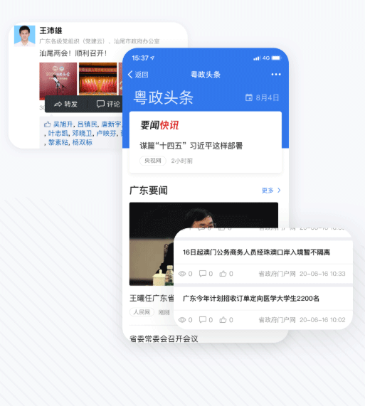 软件内除基础的办公功能以外还有实时更新的粤政头条新闻,也可以和同事互动,转发,评论,点赞。