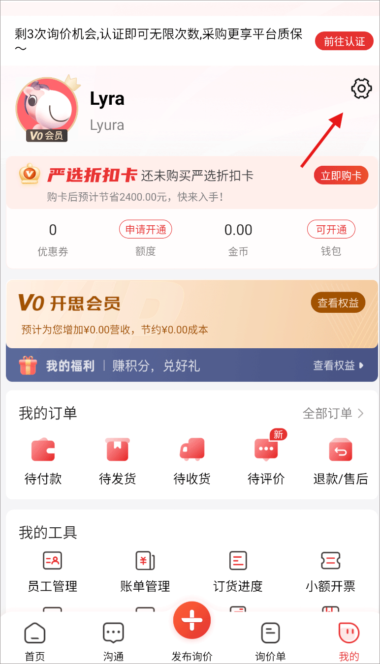 2、进入 “我的” 页面点击右上角的 “设置” 图标