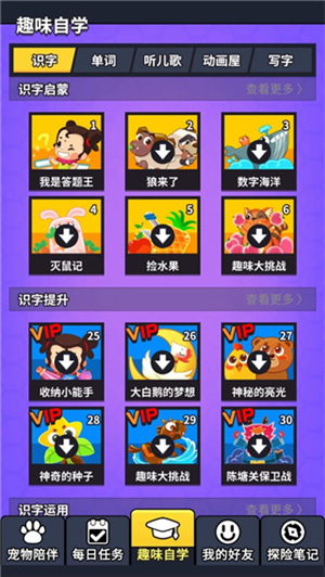 丰富且优质的课程内容,包含识字、英语、儿歌、写字课、动画屋等。