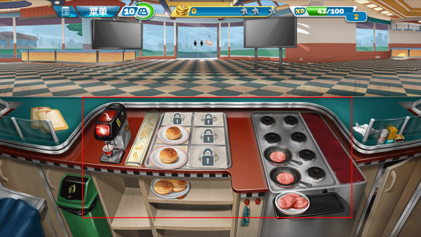 3、当你制作的牛排已经烤焦了,可以点击牛排并将它移动到垃圾桶里面。你需要完成关卡开头给与你的目标指数,这样就可以达成今天的业绩要求了。