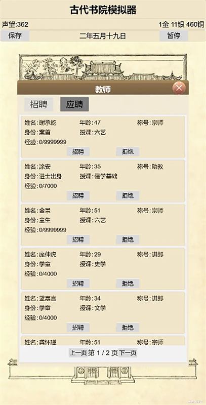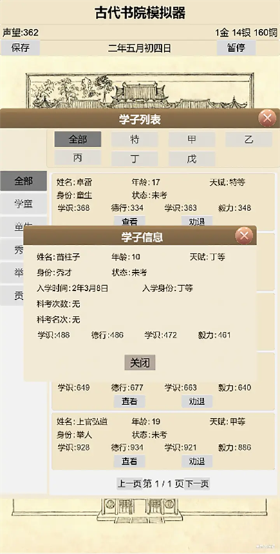 3、每年2月初童生试,考过可以升学,但是会因为书院等级不够而离开,未通过可以选择留级,但是这块完全是玩家手操,如果没选择,等过了时间学生都离开,本人开局就因为点关了而导致学生全都消失。