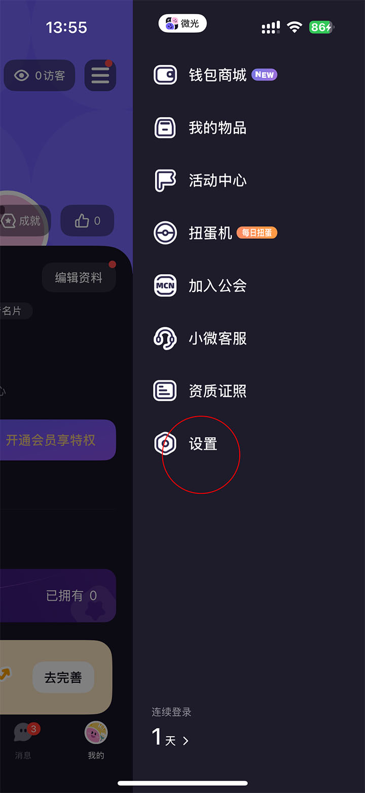 2、进入我的页面点击右上角的三条横杠图标