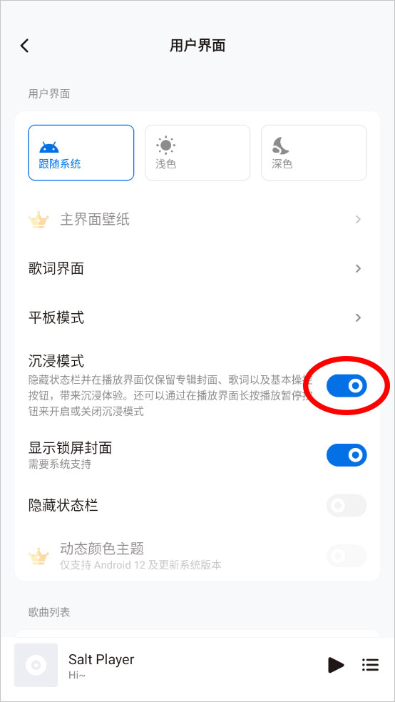4、在用户界面设置中,找到沉浸模式,点击后面的开关按钮,