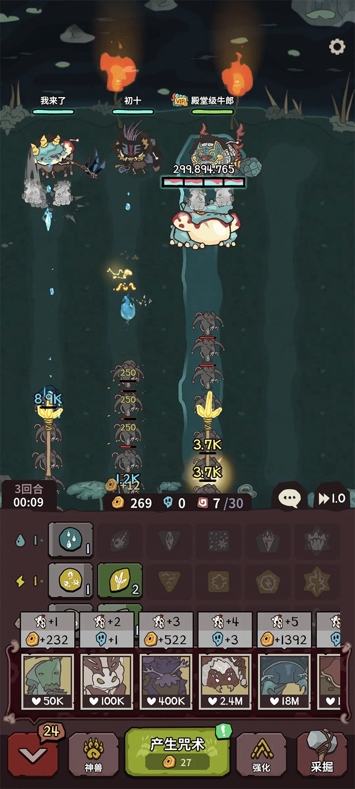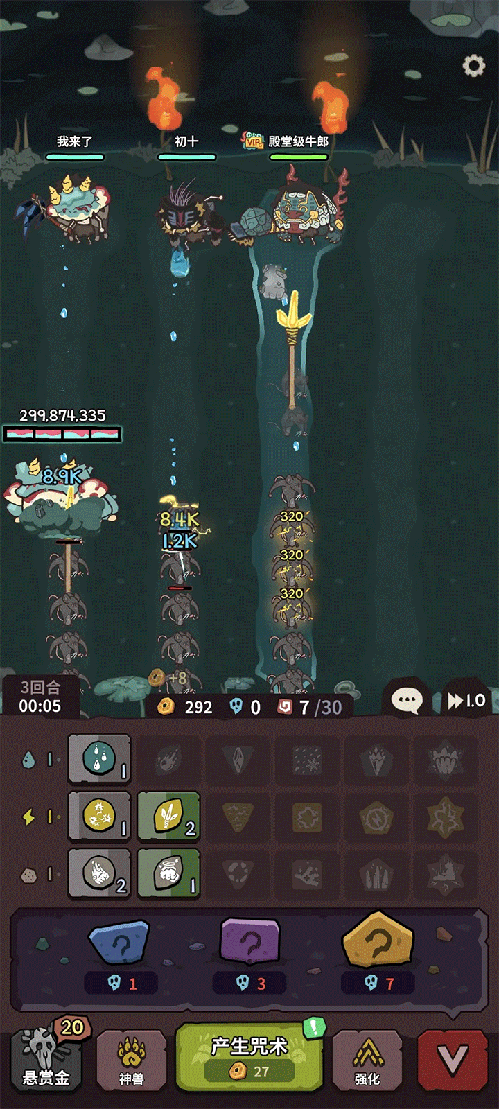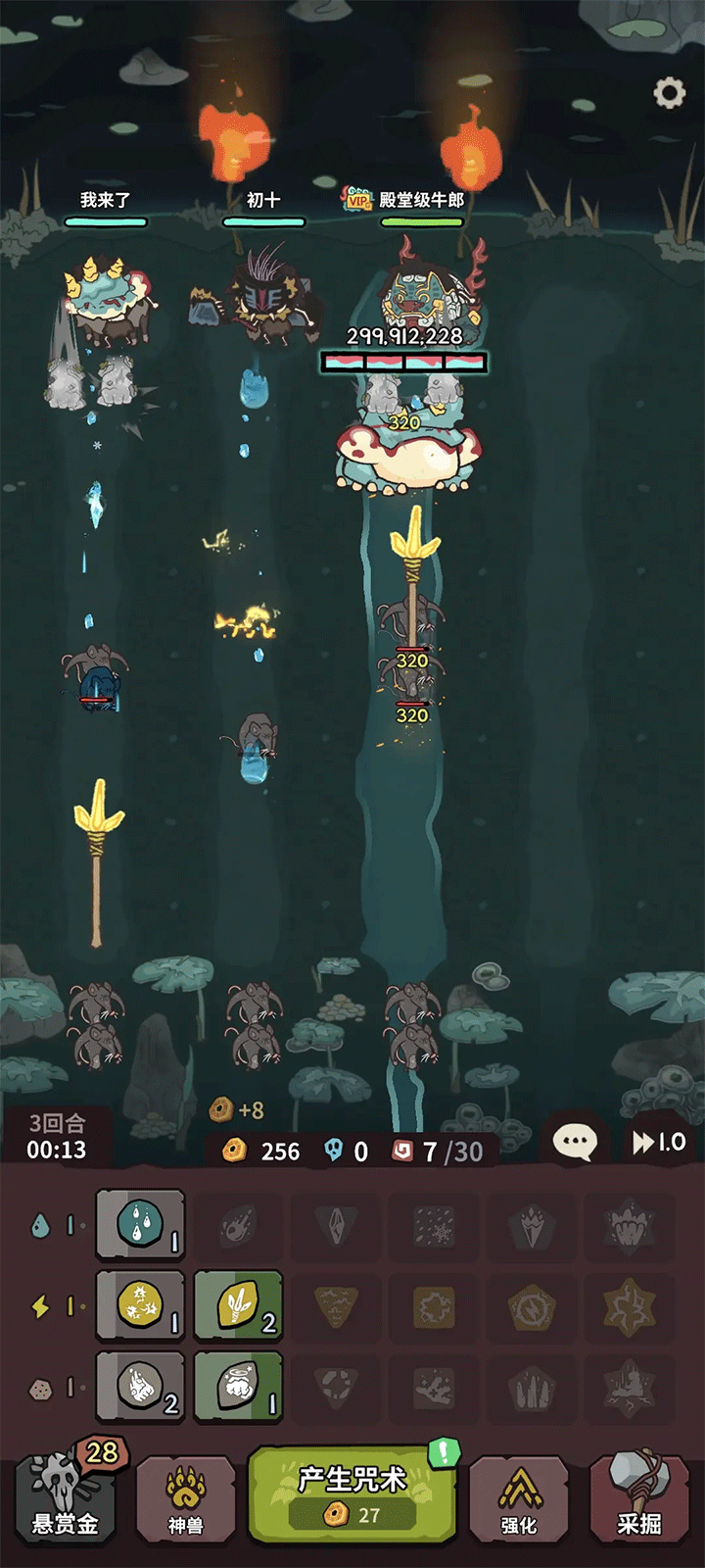 玩法就是:召唤咒术→合成高级的咒术,召唤神兽协助(不耗咒术)→成功抵御动物进攻。