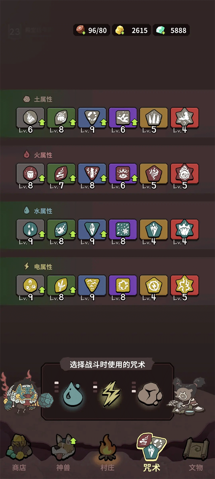 是强化界面,可以强化咒术伤害,召唤出高级咒术的概率,神兽技能属性,战斗中建议优先强化电属性强化顺序建议(召唤概率,电,神兽,其他两种属性),另外两种属性哪个6级咒术多就优先升级哪个。