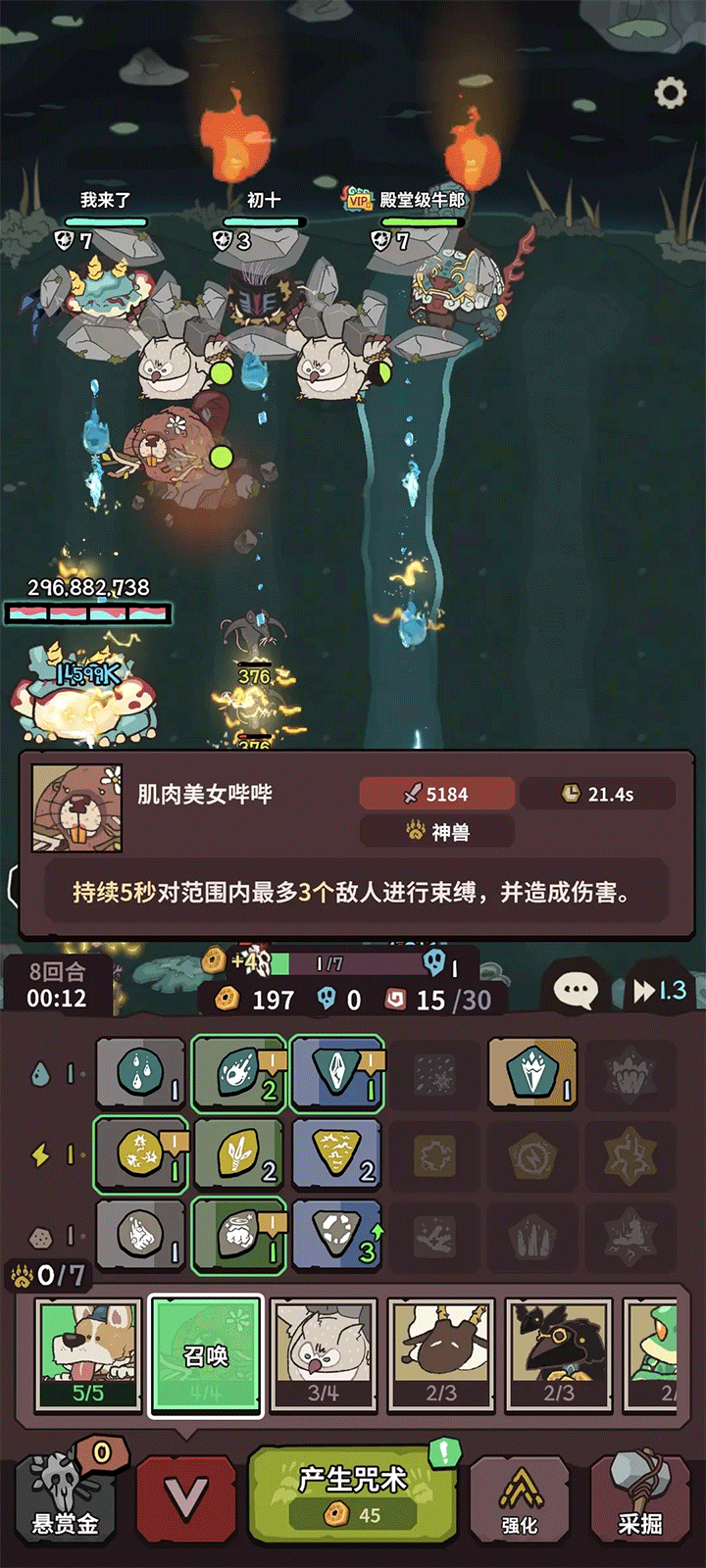 神兽建议召唤:大祭司毛毛(回血,永久叠伤害),乌鸦爷爷(持续增加金币),贤者胖胖啾(减少咒术cd),缸瓦喵(概率增加金币和灵魂的同时,概率强化技能,可以突破强化上限),死神青蛙(可以造成目标当前生命值百分比伤害,困难模式多了一个BOSS,打BOSS很好用),肌肉美女吱吱(强控角色,非常好用),闪电小偷伊莱马斯克(存储电属性造成的伤害,有怪才放,有时候甚至可以直接秒BOSS)鉴于闪电小偷一定要抽卡才能获得,需要点运气,所以可以用“浣熊超人”代替一下。