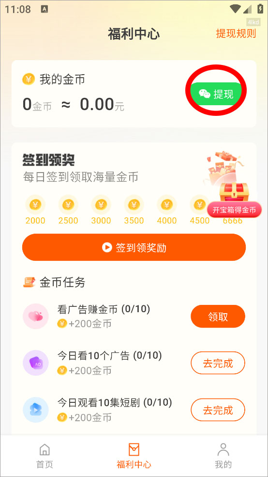 2、进入福利中心页面点击提现按钮