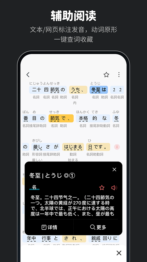 搜索结果中,这款MOJi辞书也用独特的颜色以及格式化来清楚地展示词汇的性质,包括动词是他动词还是自动词、是一、二还是三类动词等等性质。释义中还为你展示列举了不少例句帮助你记忆。