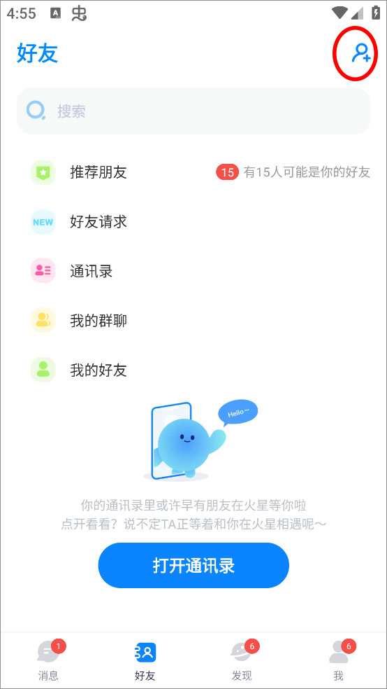 2、进入好友界面点击右上角的【+】图标