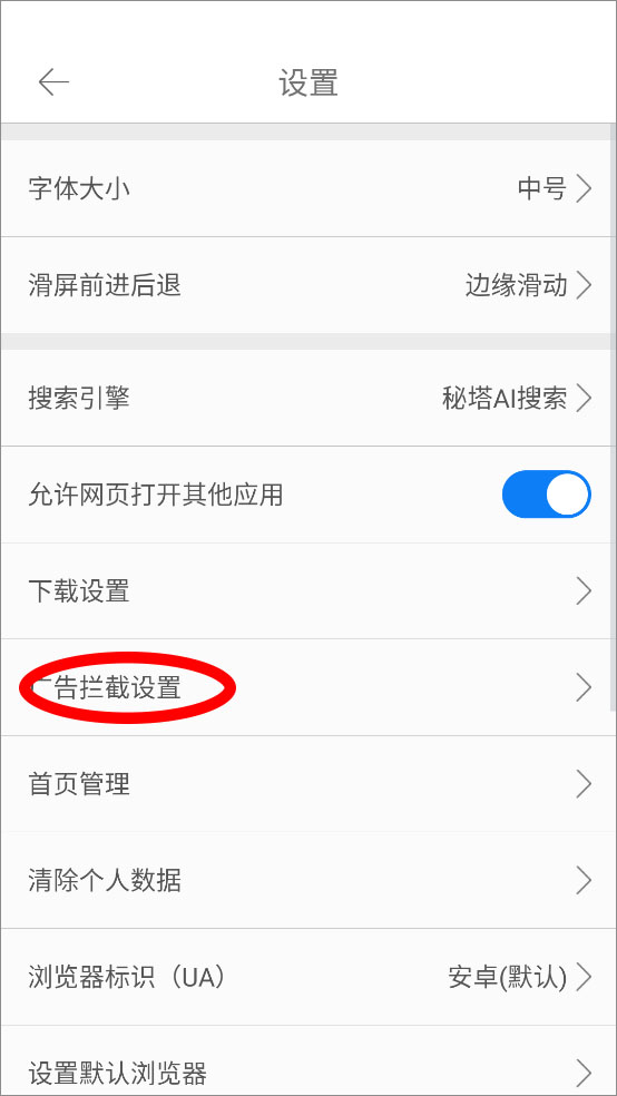 3、进入设置界面点击广告拦截设置