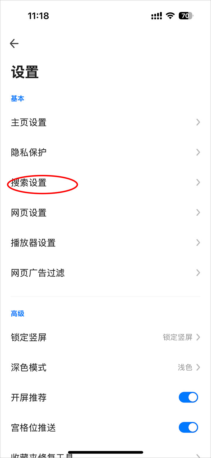 3、进入设置界面点击搜索设置