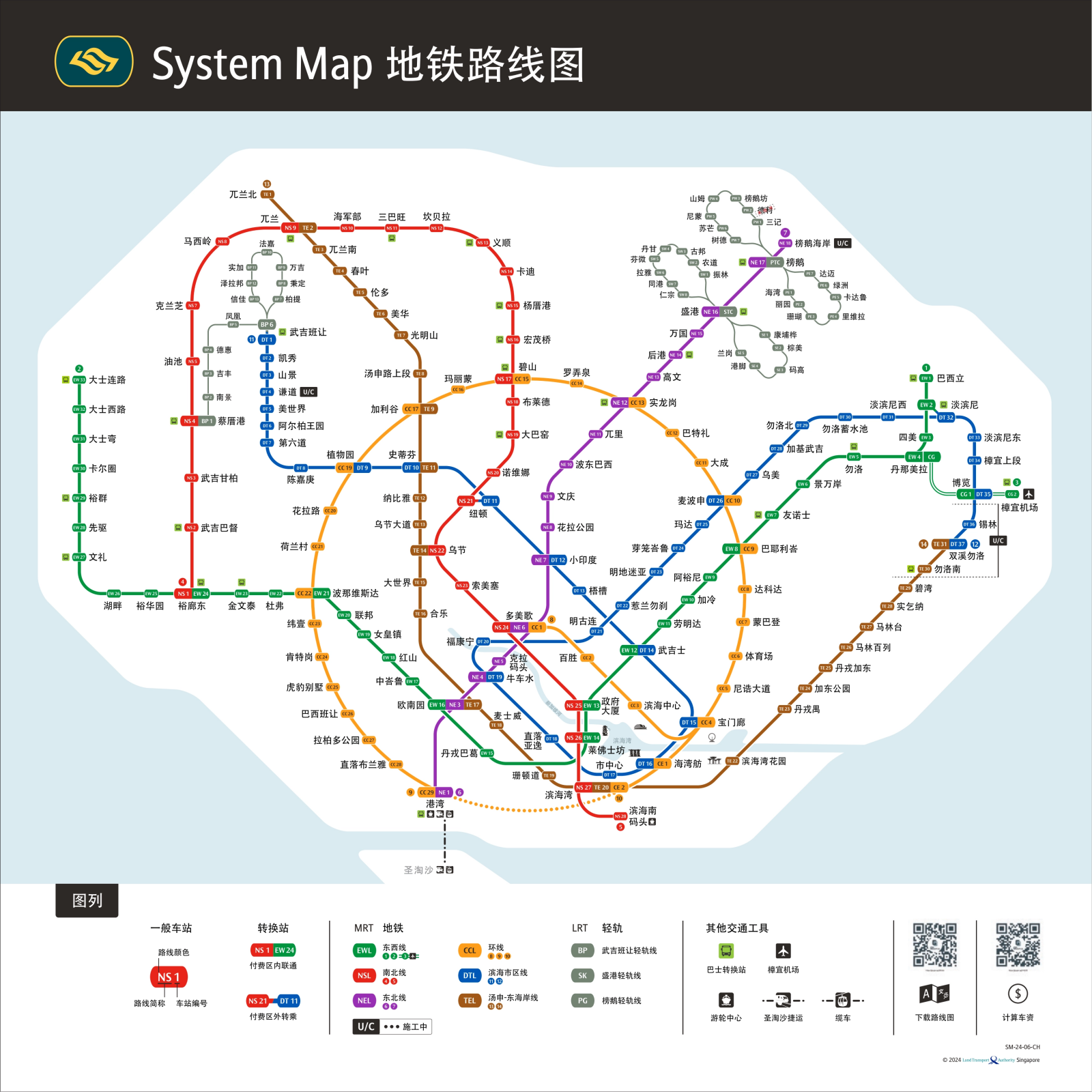 新加坡地铁又叫大众捷运系统 (Mass Rapid Transport,简称MRT)开通于1987年,位于新加坡,是世界上最为发达、高效的公共交通系统之一。当前设有113个地铁车站,148.9公里的标准轨距线路。服务从早上5点30起到凌晨1点结束,班次约1到5分钟一次。该系统分6条路线,东西线(绿线)、南北线(红线)、东北线(紫线)、环线(橘黄)、滨海市区线(蓝线)、汤申-东海岸线(棕线)互相联系各个角落,并且通往数个观光胜地,公众只要查看站名记住其颜色及号码即可使用。新加坡的铁路交通主要以地铁为主。