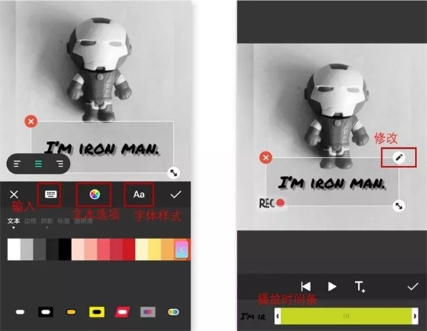 点击「T」符号,即可添加字幕。如图所示,在「文本选项」中,可以修改文本颜色、边框、阴影、标签等,点击「打钩」符号即可完成。