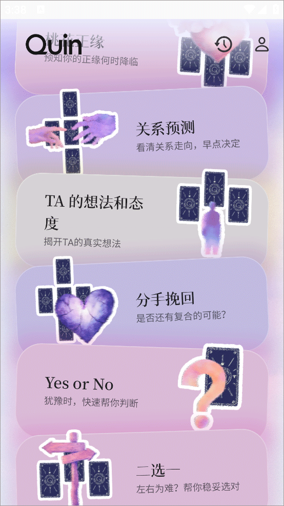 Quin app是一款智能塔罗牌软件,其融合了AI功能与古老的塔罗牌智慧,包含涵盖星座运势、星座性格、星座配对、星座生肖、事业、爱情、财运等各式各样的类型应有尽有,可以满足用户对自己未知领域的探索,还能通过塔罗牌的占卜结果,在你迷茫的时刻带来正确的引导,并且提供专业的个性化预测,用户可以随时随地在线提问,系统会做出即刻回应,帮你分析解读。同时该款软件相当重视用户的隐私保护,提供了一个安全、私密的倾诉空间。