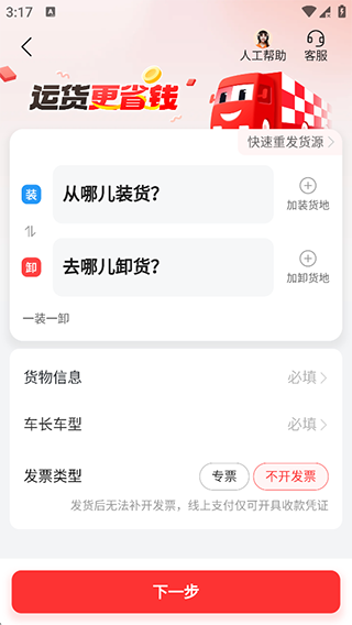 一键发单匹配:输入货物信息(重量、体积、目的地等)后,系统自动匹配附近合适车型的司机,支持从面包车到17.5米大车全车型选择