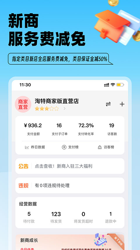 支持极速入驻,新商家享指定类目服务费减免、保证金减半、300 元推广券等扶持政策。