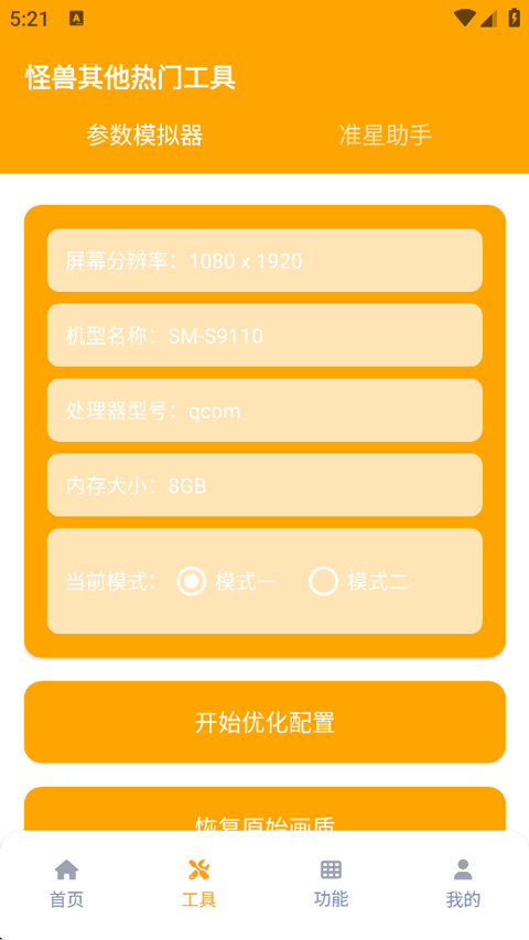 1、参数模拟器:智能适配机型,支持自定义分辨率与运行模式。