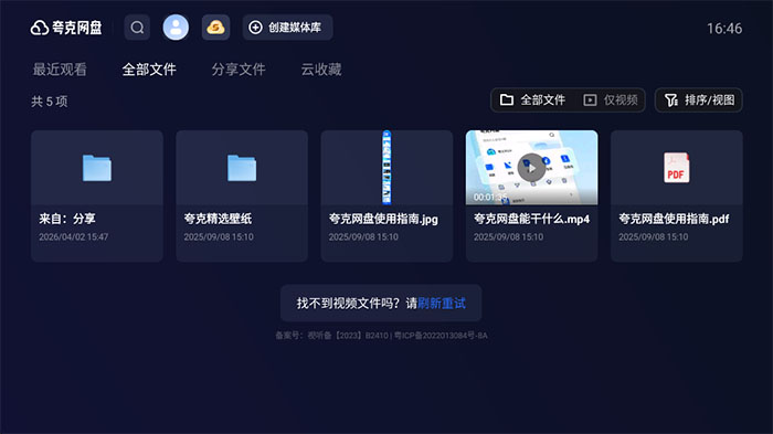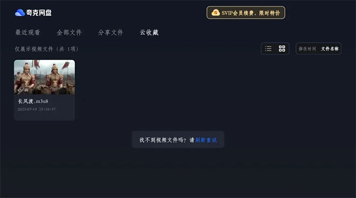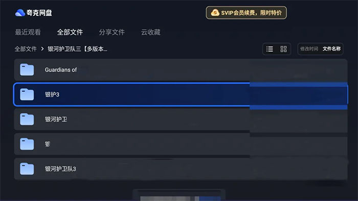 3、之后点击全部文件夹,即可看见保存的全部文件,下面的菜单栏依次是最近观看、全部文件、分享文件、云收藏,可以按照列表或宫格、类型、时间等进行排序