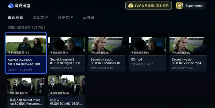 2、登录之后就能进入夸克网盘TV版了,首先打开的是最近观看界面