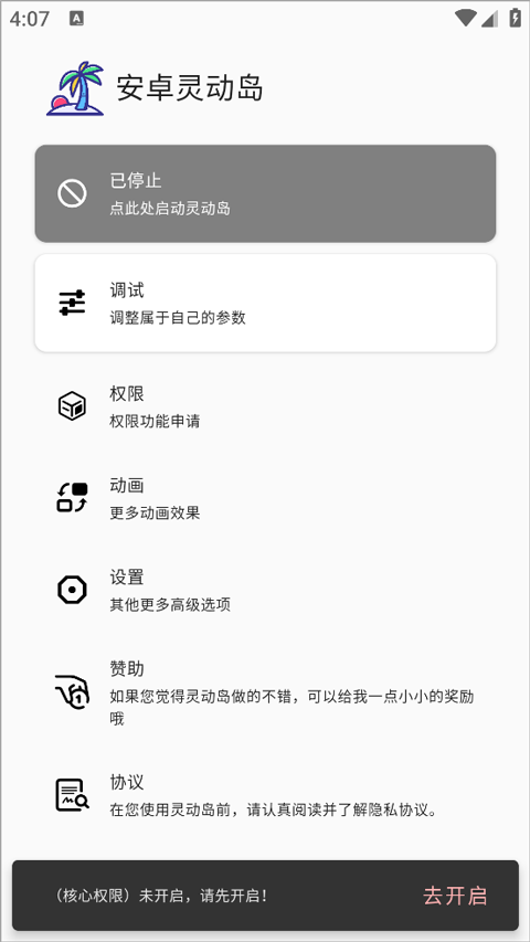 1、首先打开软件后会显示功能已停止,点击后出现核心权限未开启的提示,接着点击去开启即可自动跳转至权限处开启权限