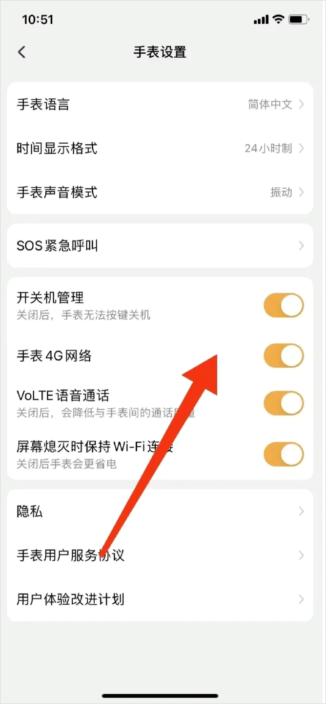 3、将开关机管理,手表4G网络,volte语音通话,屏幕熄灭时保持WiFi连接,四个选项全部打开后手表即可重新开机