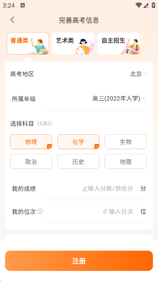 1、首先登入账号,填写具体的高考信息,有地区、考试类型、考试科目、年级等重要信息