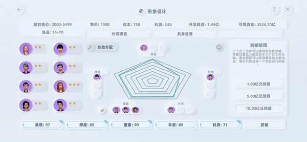 卖点的完成难度是不一样的,在初期硬件卖点的难度相对偏高,设计和软件相对容易。在初期特性要求100分的卖点,通过拉条或者堆硬件是很难完成的,如果合理使用“突破”功能,整体的完成难度会降低很多。另外在初期也不建议去做有100分特性要求的卖点。