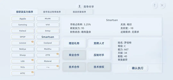 手机帝国游戏中还包括信用评级、企业并购、情报系统、员工培养、公司战略等其他好玩的元素等待你来探索。