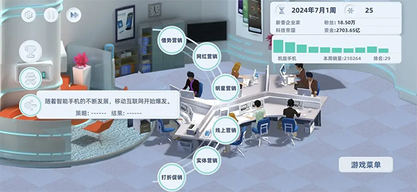 手机帝国是一款模拟经营游戏,玩家将扮演2001年获得投资的创业者,通过35年时间(2001-2035年)从研发九宫格手机发展到AR智能眼镜,建立科技企业并参与行业竞争。玩家需要合理经营公司,包括控制员工的酬劳、研发的成本,以及规划销售模式,占领市场份额。游戏中的运营、经济系统丰富,有营销策略、预估市场、贷款、收购等元素。游戏中还包括65种完全不同的手机图纸和超过100种手机外观,从九宫格键盘手机到全面屏、折叠屏甚至包括了未来的AR智能眼镜,大量的神秘图纸等待你来发掘。