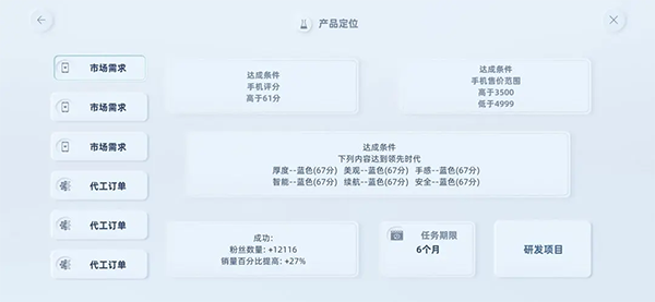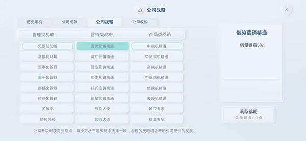 1、每次公司升级会获得一个战略点,研发的手机分数越高,公司升级速度越快,新图纸有20 % 的经验加成,新的卖点组合会有50%的经验加成;