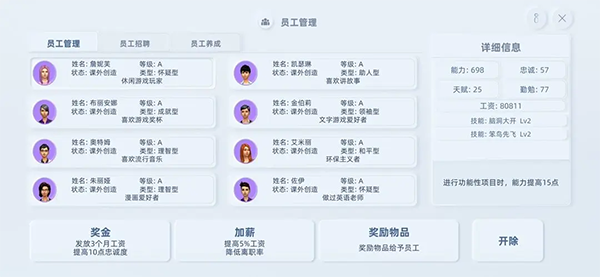 5、忠诚度:如果你用的不是自动加忠诚度能力的主角,员工的忠诚度会逐年降低,忠诚度过低会离职或者被竞争对手挖走,加薪、奖金或者吃书都可以快速提高忠诚度。