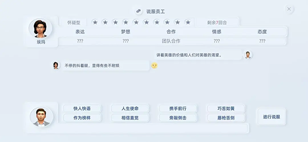 为了更好的模拟现实生活中的人才招揽过程,我们在游戏中内置了一款小游戏,该游戏以古老的“九型人格”为原型,玩家需要根据招募对象的不同人格类型,采用不同的沟通技巧和策略来说服对方。越是顶级的人才,说服的难度越高。