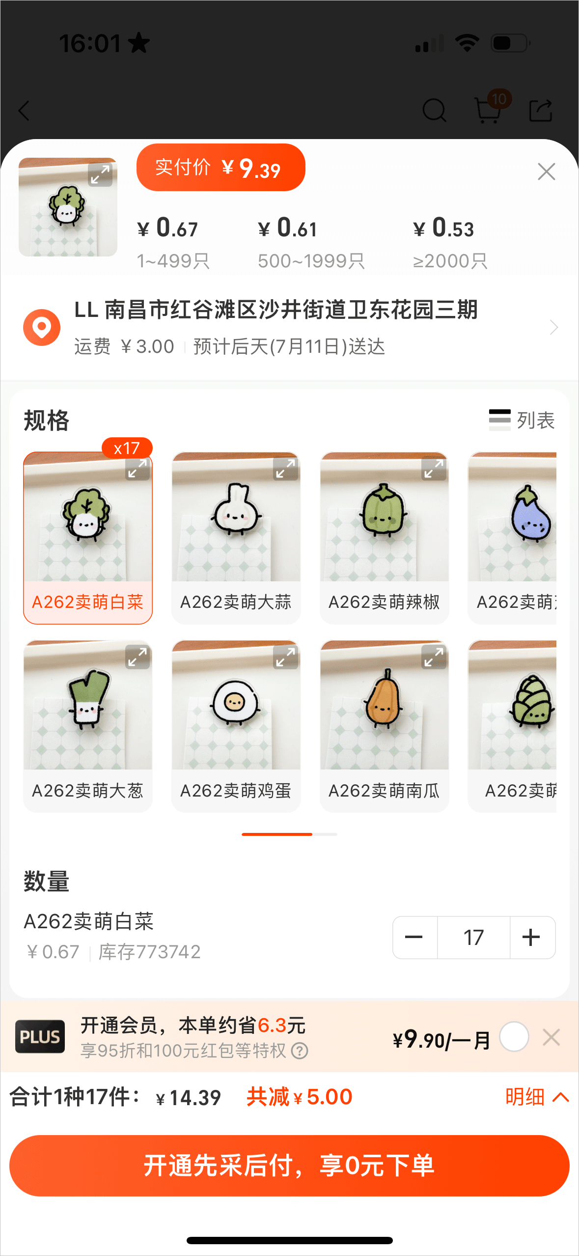1、首页可以挑选想要的物品或者直接进行搜索,点击下单后会有显示库存量可以无限加购,选好后可以直接下单