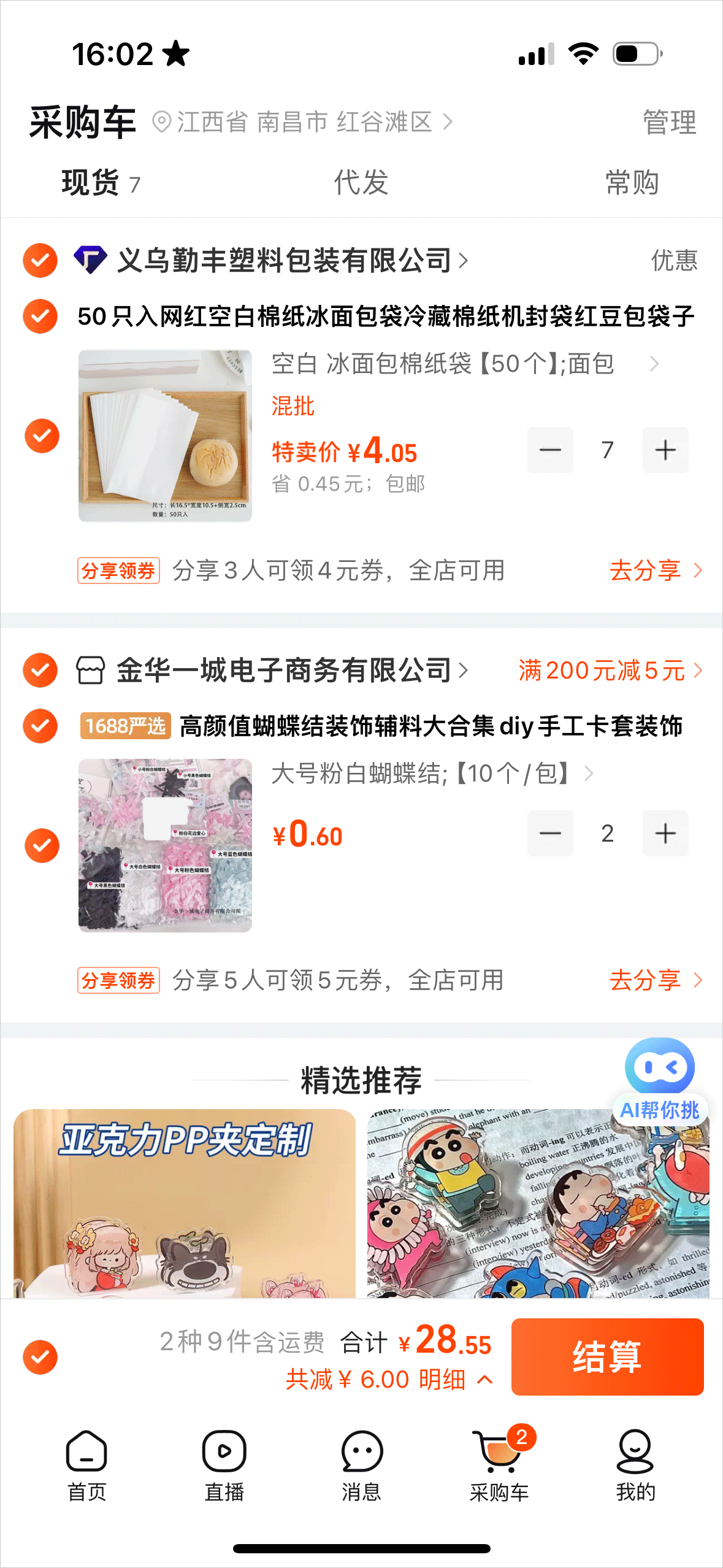 2、也可以先添加进购物车后一起下单结算