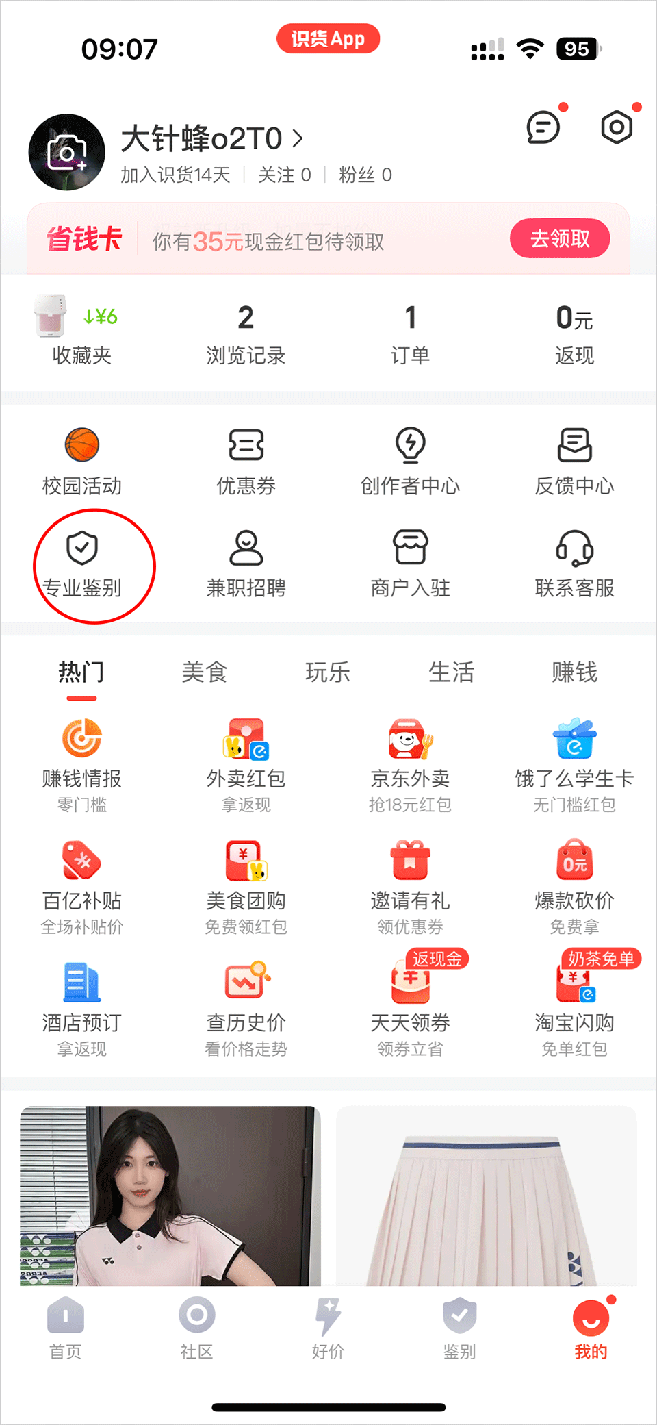 1、打开识货APP最新版,进入“我的”页面,点击“专业鉴别”选项
