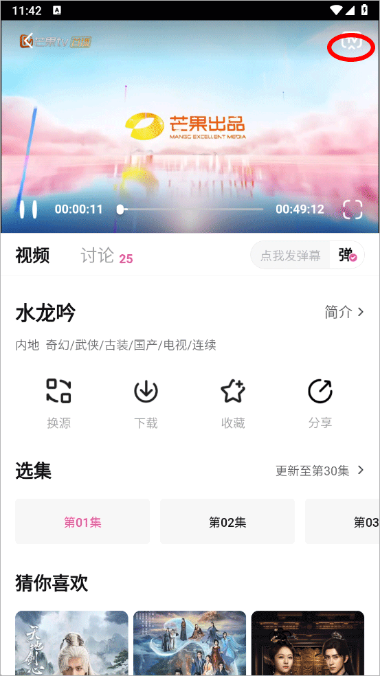 2、进入播放页面点击右上角的tv图标