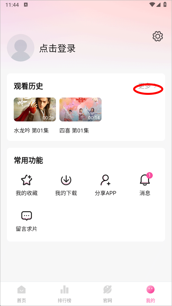 2、进入我的页面点击观看历史后的更多