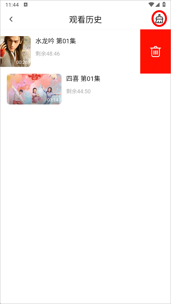 3、可以直接点击右上角小扫把图标一键删除,或者左滑要删除的剧目点击删除即可