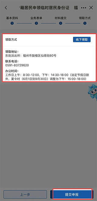 7、领取方式为线下领取,确认相关领取地址后点击【提交申报】即可。