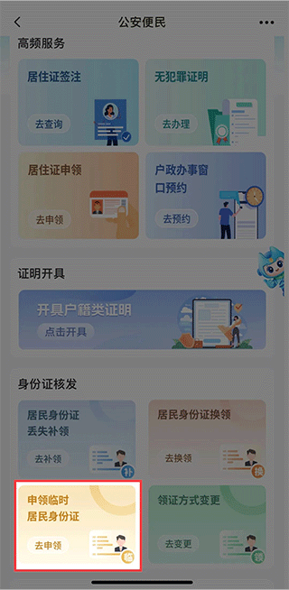 2、在【身份证核发】栏下点击【申领临时居民身份证】。