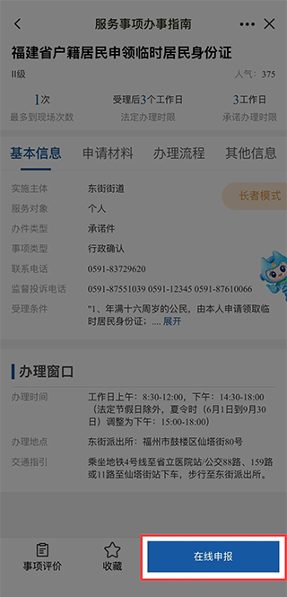 3、选择办理站点进入服务办理页面,点击【在线申报】。