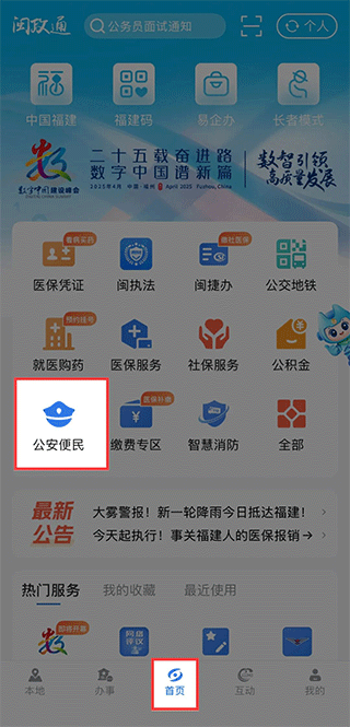 1、登录闽政通APP 【首页】打开【公安便民】。