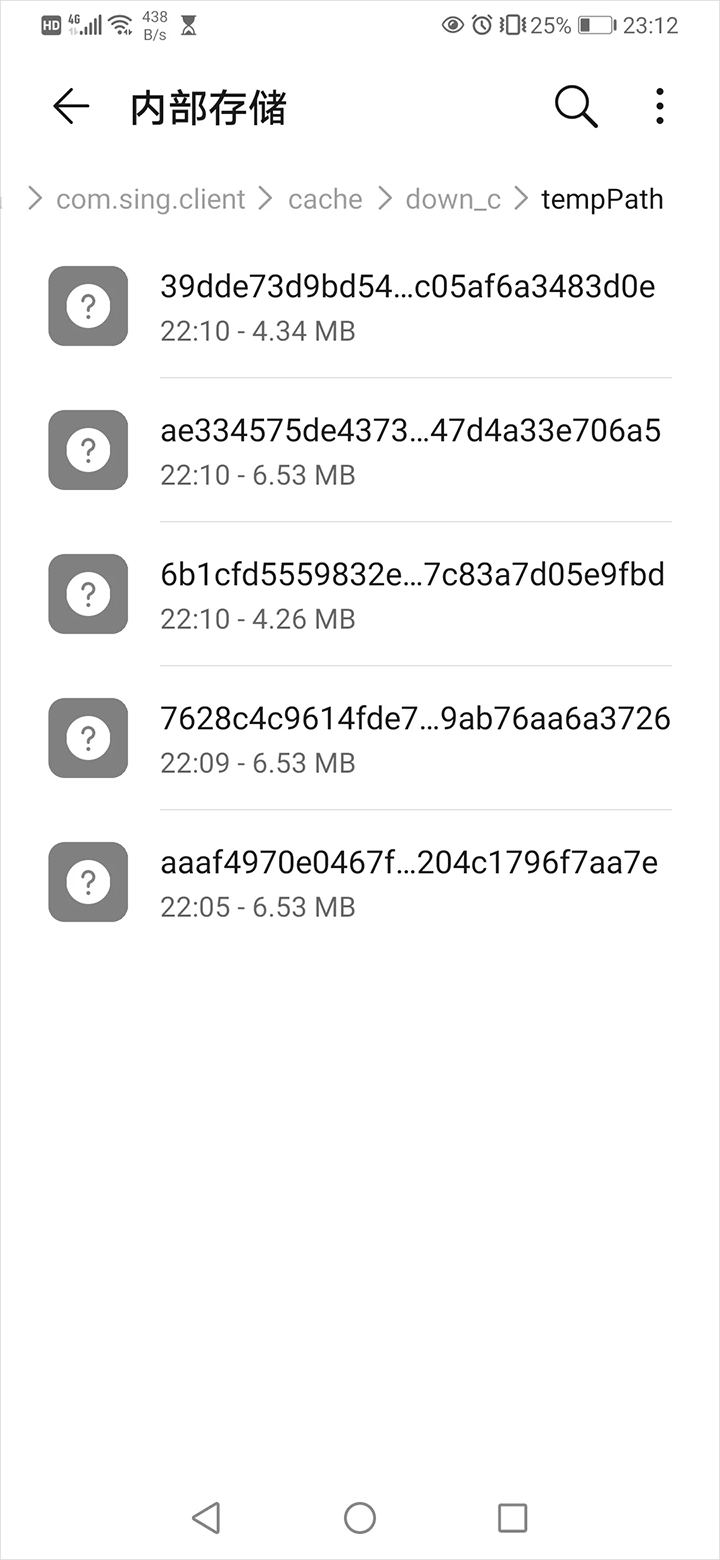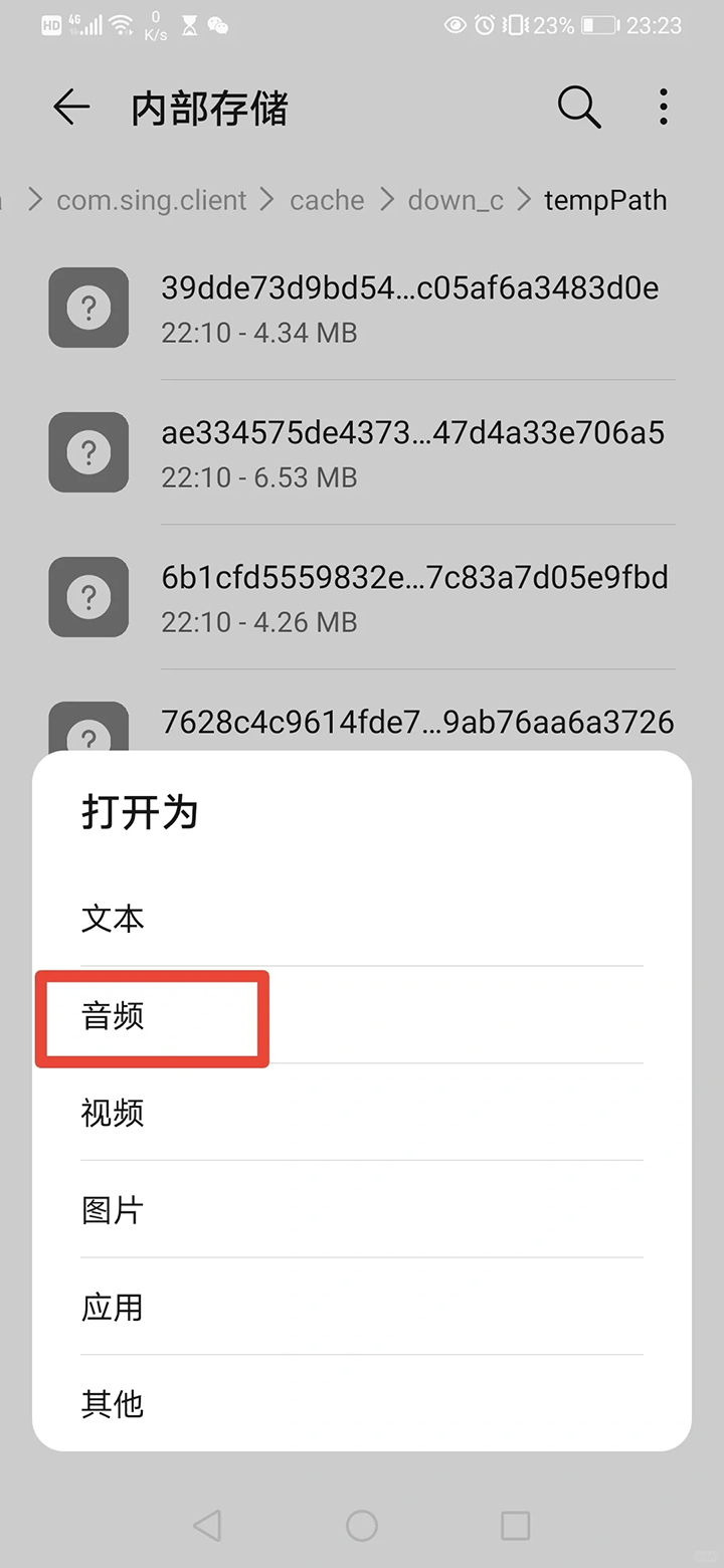3、继续按p3的路径点进去,找到临时存放文件的地方tempPath,点进去,就会发现有好多名字很长的文件。其实它们都是刚刚听过的音频,可以一一点#开找到自己想要的伴奏音频。选择打开为音频,用华为自带播放器就行。