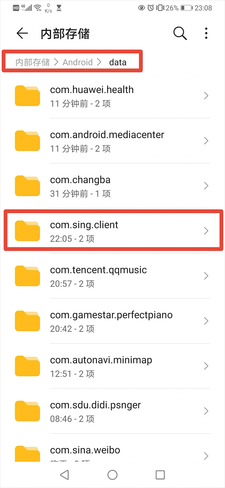 2、打开文件管理,找到p2的路径。这个路径里面有好多APP缓存的文件,图中框出的是5sing的文件夹,点开它。