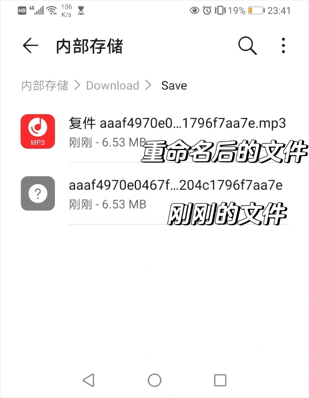 5、发现到这里还不能从微信直接打开这个文件,因为没有后缀名。所以可以在内部存储里把它复制一份,做个重命名,也就是文件名改成.mp3后缀,这样就可以直接点开咯
