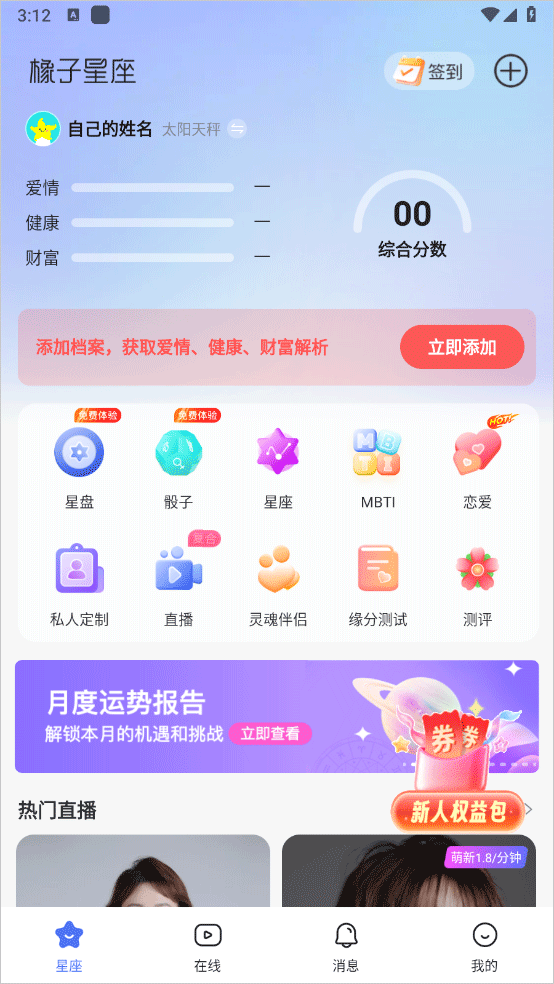 1、打开橡子星座app官方版进入首页可以添加档案预测星座运势等